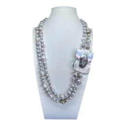 Collana a due fili degradanti di perle barocche grigie e maxi chiusuta in argento e piaste di perla Mabè naturale
