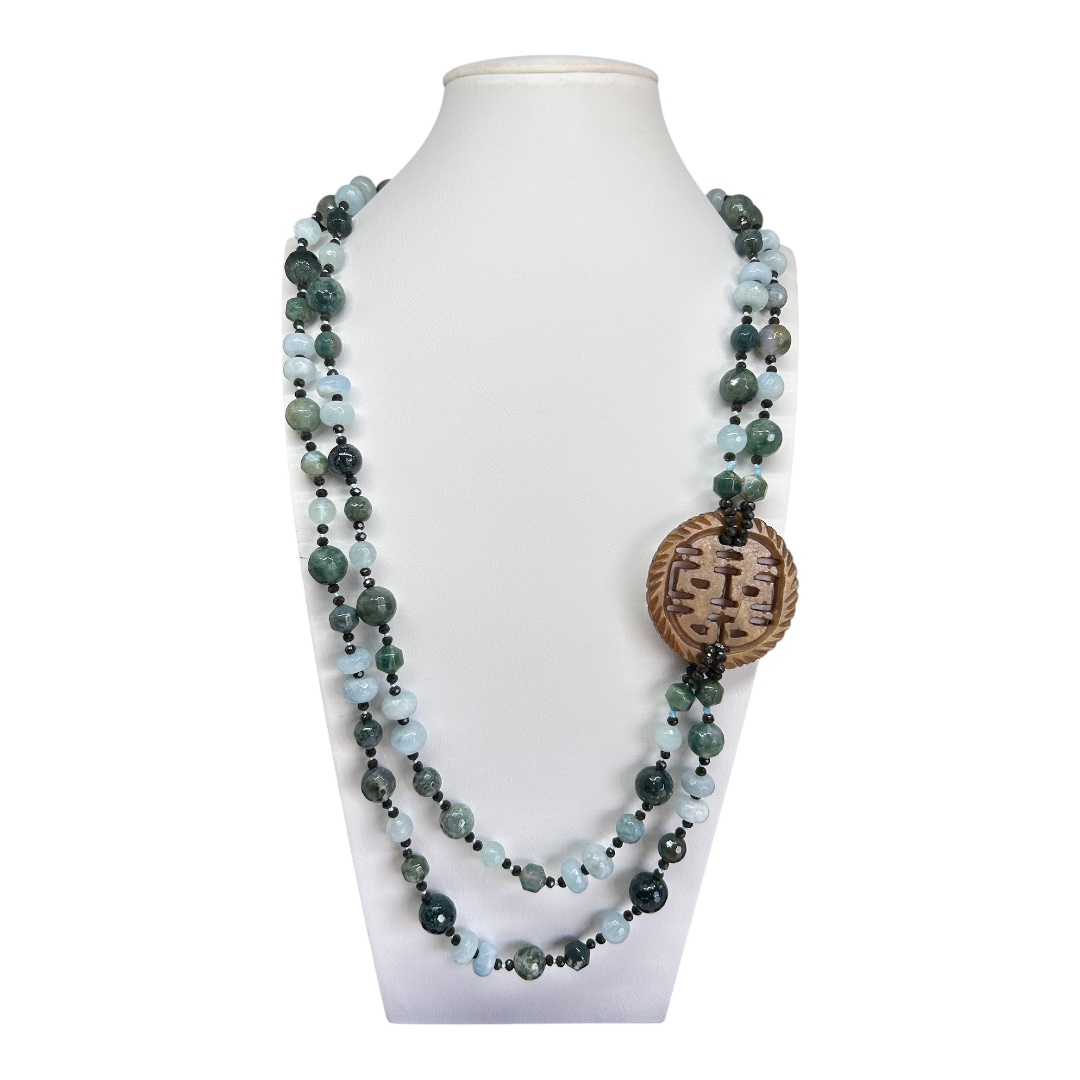-Acquamarina naturale sfaccettata, agata muschiata naturale sfaccettata, maxi inserto in giada nefrite incisa a mano e punti luce in tono.