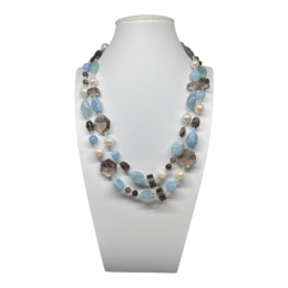 -Labradorite naturale liscia e sfaccettata, agata muschiata liscia e sfaccettata, madreperla colore crema sfaccettata e punti luce in tono.