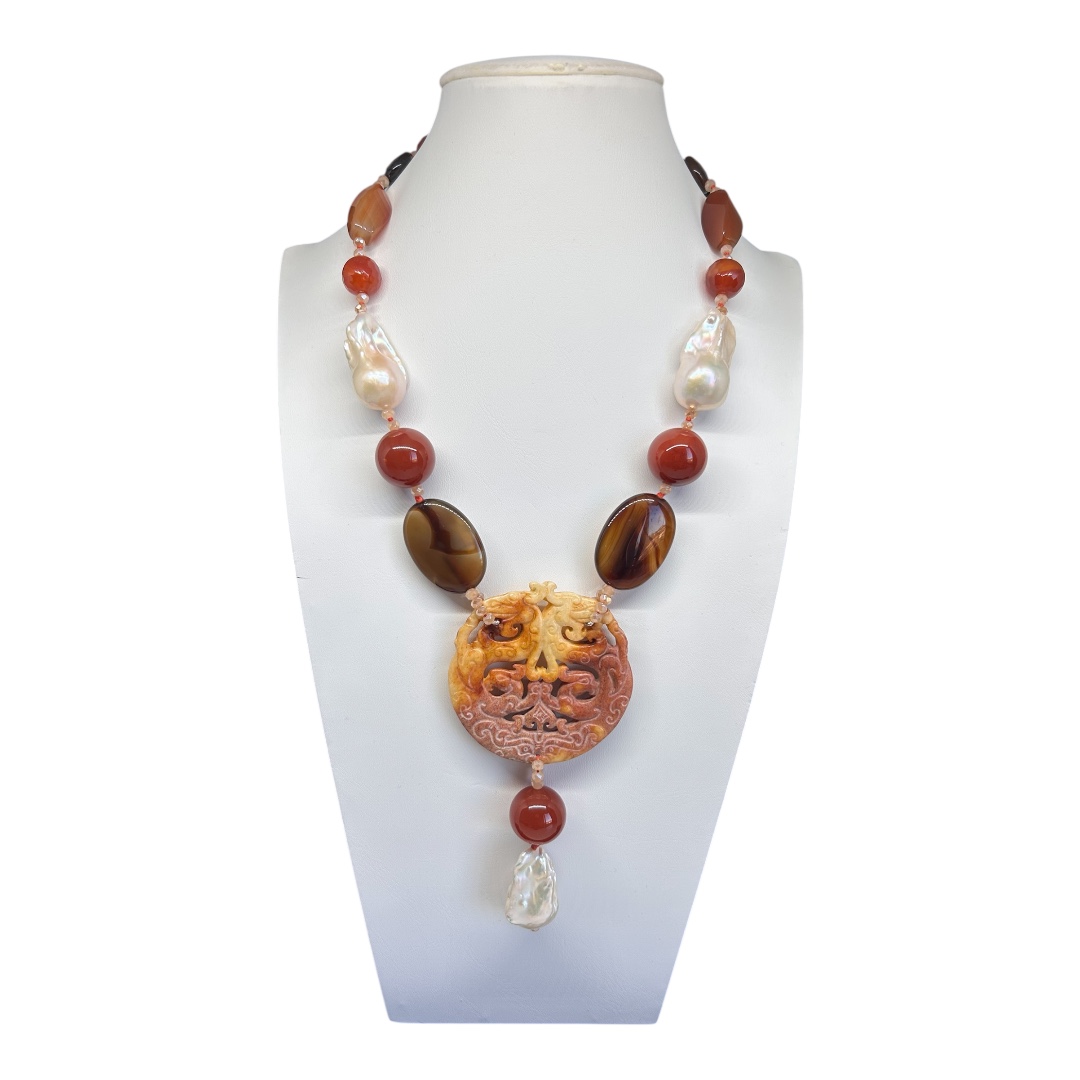 -Agata Brown etiope naturale naturale liscia, perle bianche scaramazze “Biwa”, corniola naturale liscia, maxi giada centrale incisa a mano e punti luce in tono.