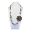 -Amazzonite naturale taglio tomblè, maxi inserto in giada nefrite incisa a mano e punti luce in tono.