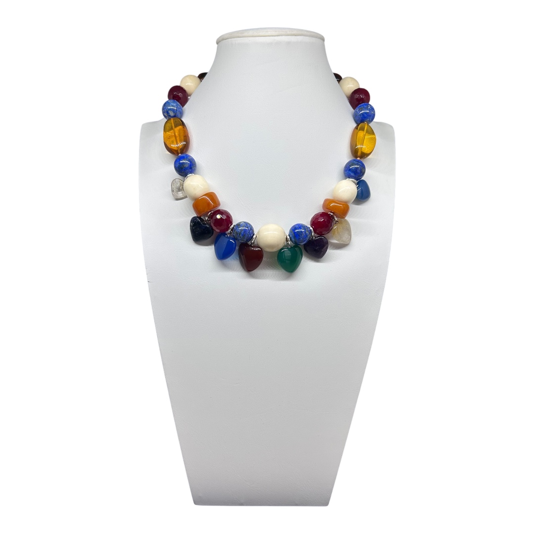 -Avorio naturale liscio, lapislazzuli naturale sferico, ambra asiatica a rondelle, ambra messicana burattata, agata ciliegia sfaccettata e cuori charms in pietra dura montati in argento.