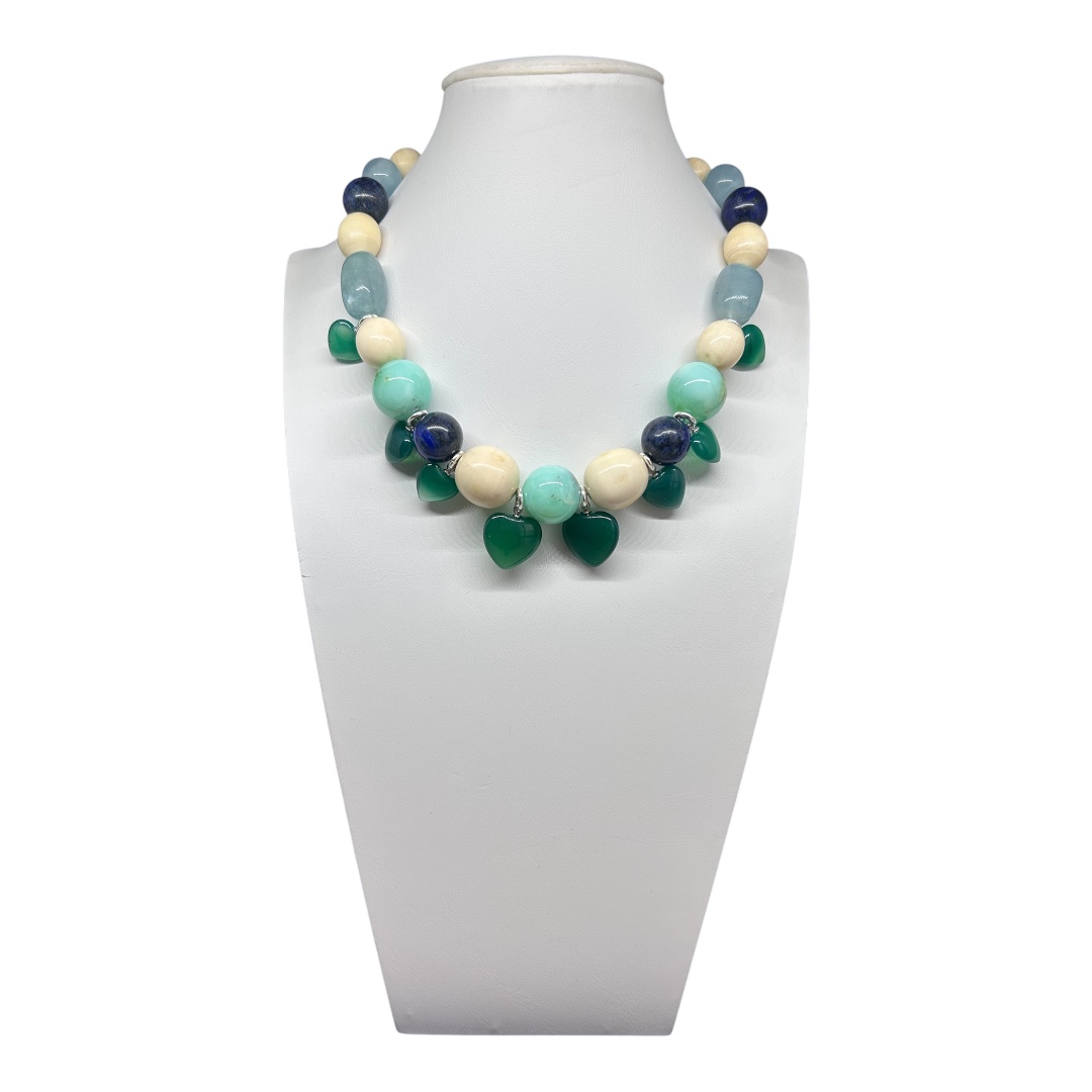 -Crisoprasio naturale sferico, avorio naturale liscio, lapislazzuli naturale sferico, acquamarina naturale liscia e cuori charms in agara verde montati in argento.