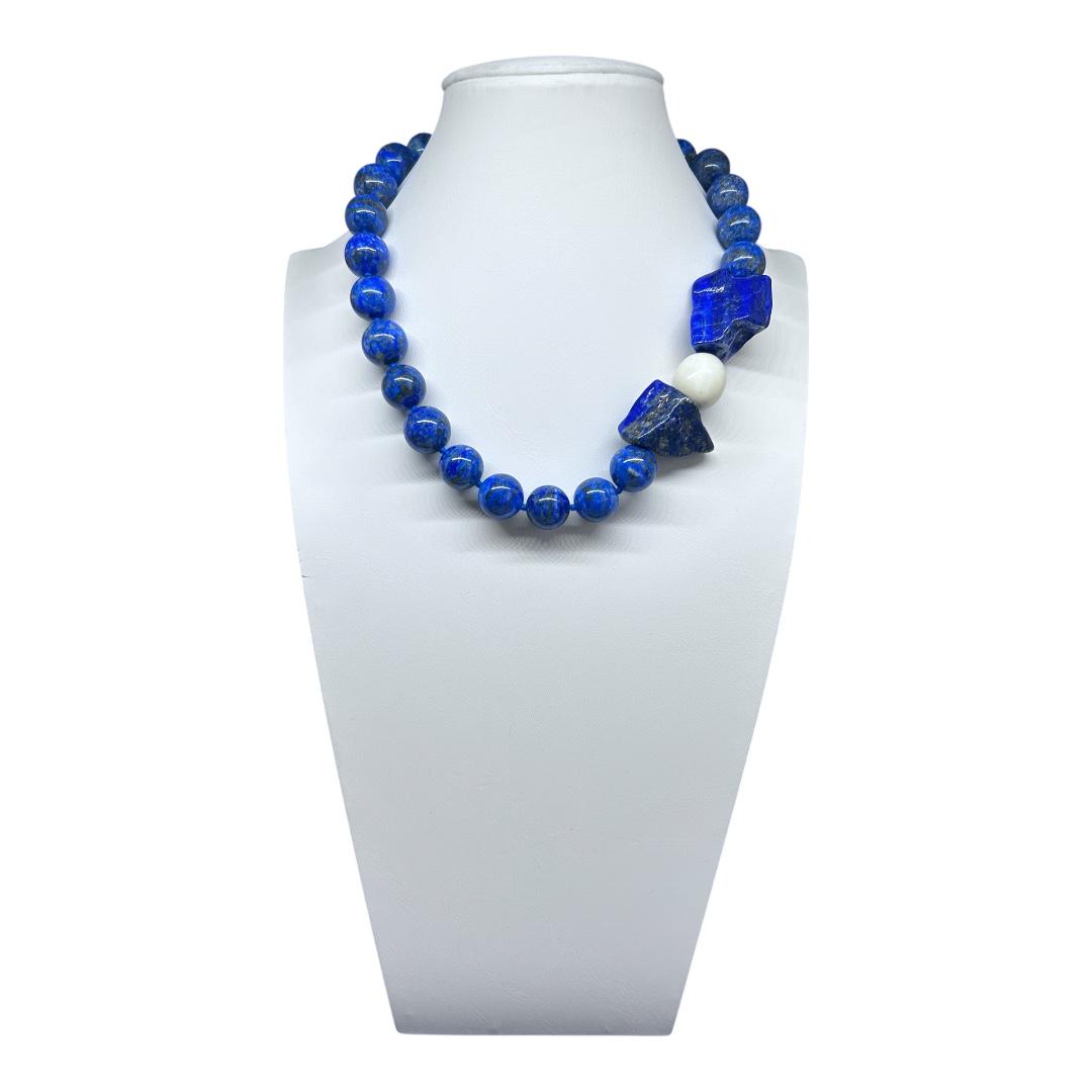-Lapislazzuli sferico naturale da 16mm abbinato a due maxi elementi dello stesso materiale in una versione grezza separati da una maxi oliva in avorio naturale liscio.