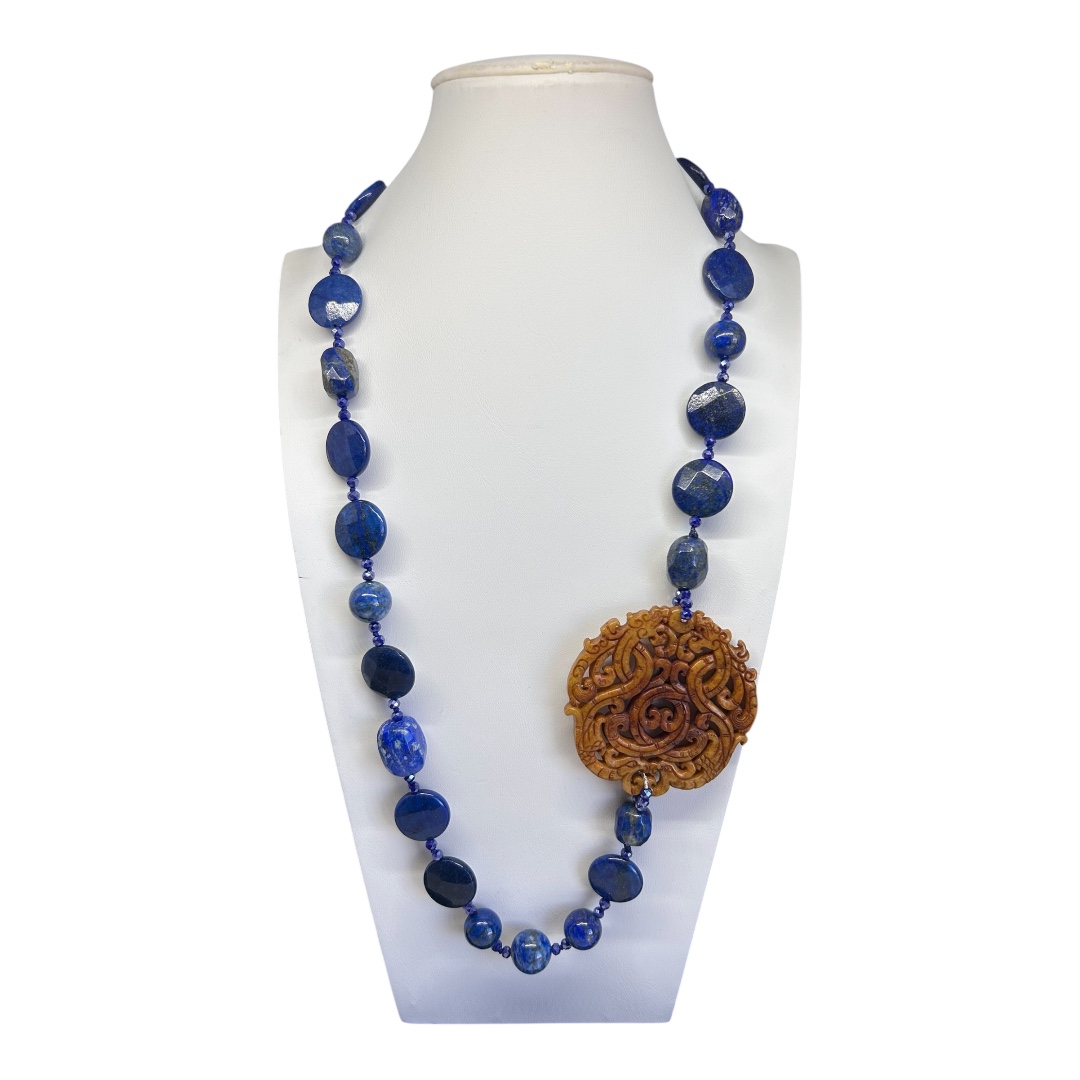 -Lapislazzuli naturali lisci e sfaccettati, maxi inserto in giada nefrite incisa a mano e punti luce in tono.