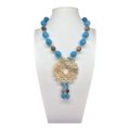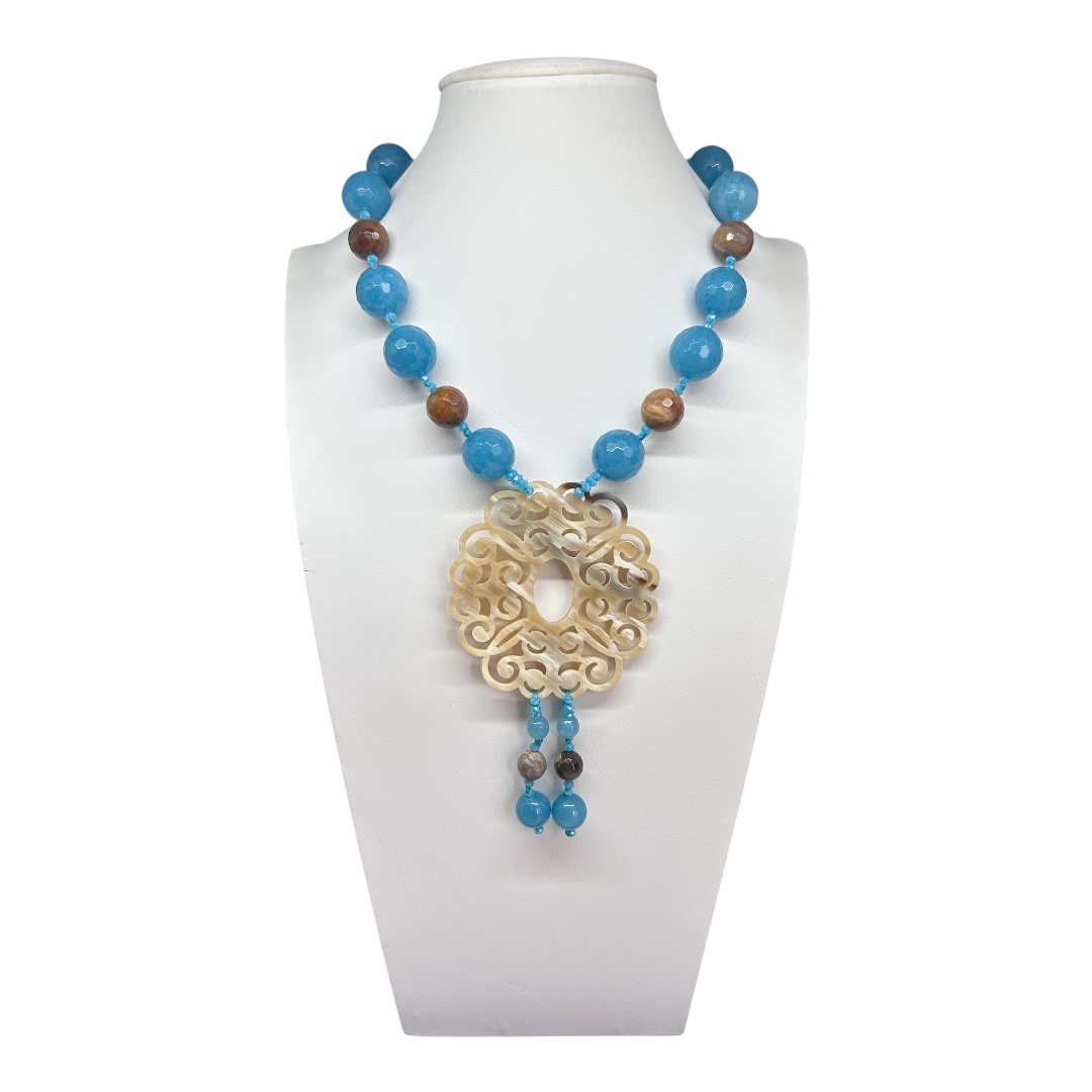 -Quarzo azzurro a sfera sfaccettata da 16mm, mokaite brown sfaccettata e maxi centrale in corno naturale traforato ad archetto, doppio pendente agganciato al centrale in quarzo azzurro e mokaite, punti luce in tono.